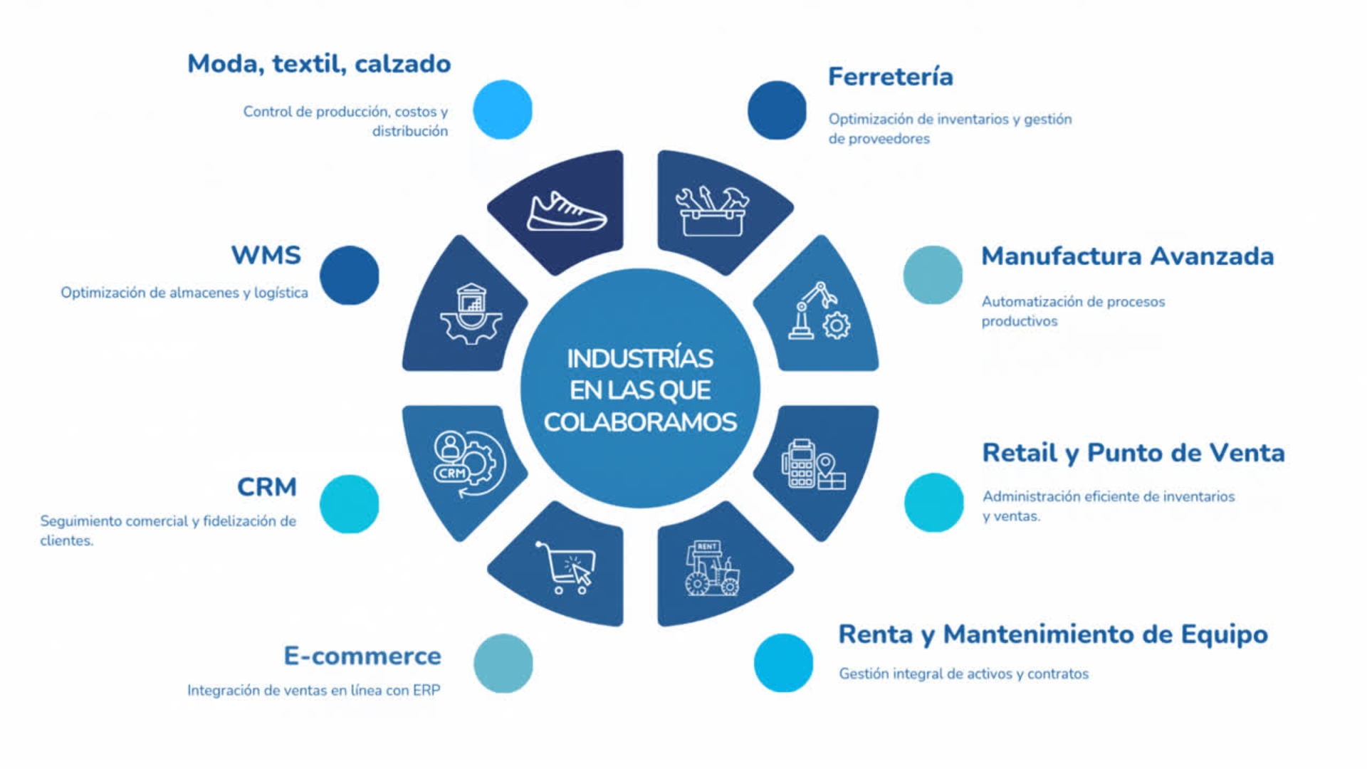 Un ERP es la herramienta ideal para industrias que requieren operaciones precisas, control de costos y decisiones basadas en datos reales. Sectores como manufactura avanzada, textil, moda y calzado, ferretería, retail, renta y mantenimiento, se benefician al centralizar procesos y obtener una visión integral de su negocio.